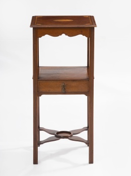 Mesa - peana en madera de caoba y marquetería con decoración geométrica y caracola central. Balda y cajón inferior. Estilo Victoriano.