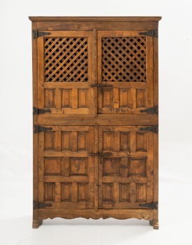 Alacena en madera de roble tallada con cuarterones, tiradores y remates en hierro.
