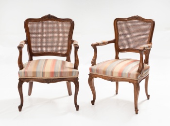 Pareja de butacas en madera de cerezo tallada con decoración vegetal, flores y respaldo en rejilla. Estilo Luis XV.