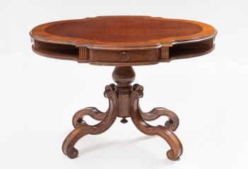Mesa de juego en madera de caoba tallada con decoración vegetal y 4 cajones. Estilo Regencia.