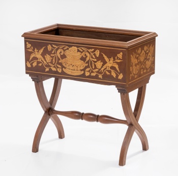 Jardinera en madera de caoba y marquetería con decoración de jarrón con flores, hojas y pájaros. Estilo Victoriano.