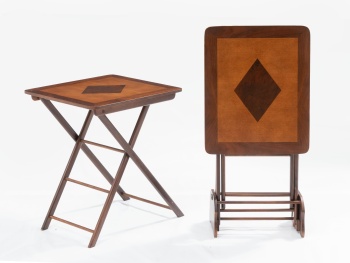 Pareja de mesas - bandeja plegables y porta mesas en madera de caoba con decoración geométrica central. Archangelus. España.