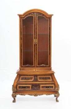 Descarga el catálogoVitrina en madera de nogal y raíz, cuerpo inferior con 2 cajones y remates en metal dorado con decoración vegetal , flores y patas de garra. Estilo Reina Ana.