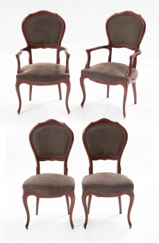 Conjunto de pareja de butacas y 2 sillas en madera de caoba, con asiento y respaldo tapizado en pana tono marrón rematando en tachuelas. Estilo Luis XV.