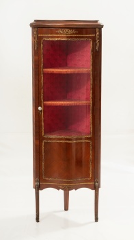 Vitrina rinconera en madera de caoba y remates en metal dorado con decoración vegetal, rocallas y perlas. Interior con 3 baldas y tapizado damasco. Estilo Luis XV. R. Soriano. España.