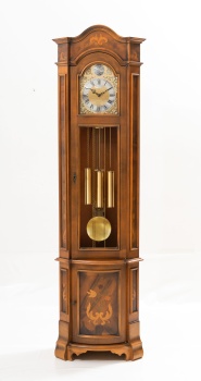 Reloj de pie en madera de nogal y marquetería con decoración vegetal y flores, esfera en latón con números romanos, ángeles y rocallas. Sonería carrillón. Estilo Regencia.