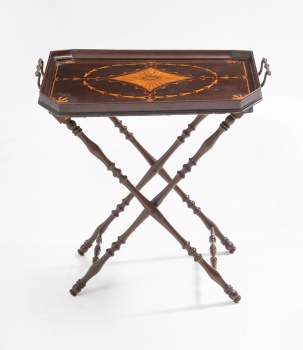 Mesa - bandeja en madera de caoba y palorosa con decoración vegetal, geométrica y asas en metal. Patas en forma de tijera plegables. Estilo Victoriano.