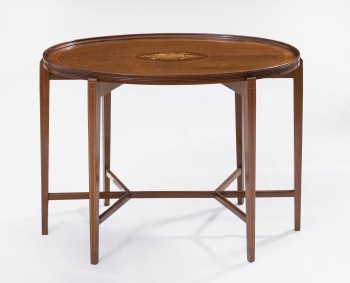 Mesa - bandeja en madera de caoba y marquetería con decoración vegetal, flores y mandolina. Estilo Victoriano.