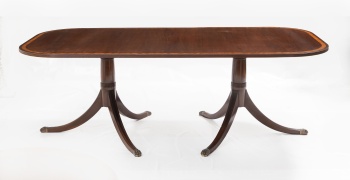 Mesa de comedor en madera de caoba y raíz, con patas talladas y rematas en bronce representando patas de garra. Estilo Regencia.