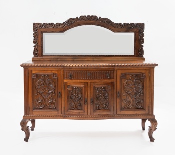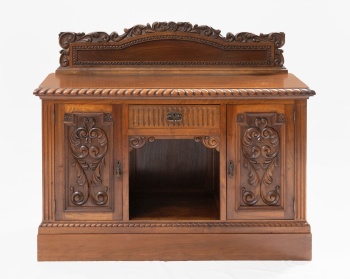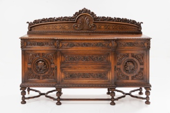 Aparador de comedor en madera de roble tallada con decoración vegetal, rocallas y medallones centrales en las puertas representando guerreros. Estilo Luis XVI. Época Neogótica.