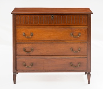 Cómoda en madera de caoba tallada con 4 cajones y tiradores en bronce. Estilo Luis XVI.