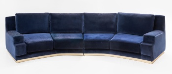 Sofá curvo de 2 cuerpos con 4 asientos en terciopelo azul noche y estructura en metal color champagne.