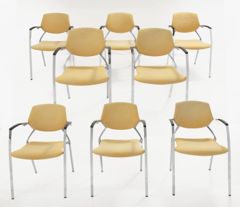 Conjunto de 8 sillas confidente de oficina con estructura en acero cromado, reposabrazos en polipropileno negro con asiento y respaldo tapizado en tela vainilla.
