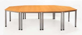 Mesa de reuniones en madera de haya con patas regulables en acero, compuesta por 2 mesas trapezoidales y 2 mesas rectangulares.
