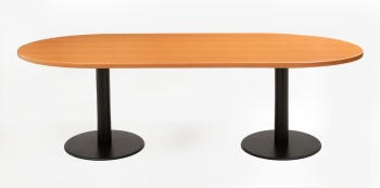 Mesa de reuniones con encimera en madera de pino y bases en metal pintado en negro.