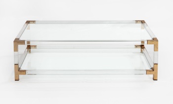 Mesa de centro en metacrilato con encimeras en cristal y remates en latón.
