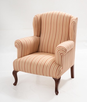 Butaca orejera con tapizado a rayas en tono beige, caldera y patas en madera de guinea. Estilo Luis XV.