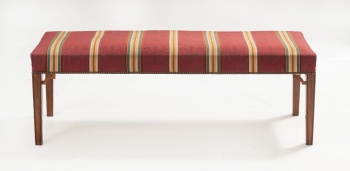 Pie de cama en madera de caoba tallada con asiento tapizado a rayas y flores. Estilo Luis XVI.