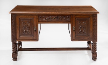 Mesa de despacho en madera de caoba tallada con decoración vegetal y rocallas con cajón central y 2 puertas a los lados ocultando 7 cajones. Patas torneadas. Estilo Luis XVI.