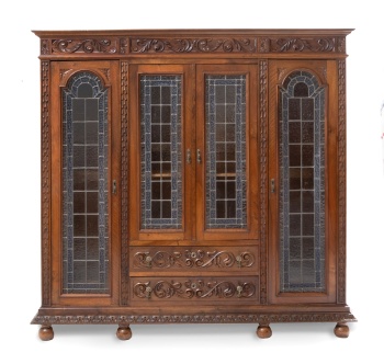 Librería de despacho en madera de caoba tallada con decoración vegetal, flores, rocallas y puertas con vidrieras emplomadas. Estilo Luis XVI.