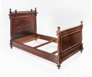Cama en madera de roble tallada con decoración vegetal y columnas a los lados. Época Alfonsina.