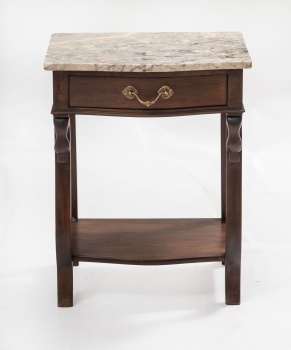 Mesilla en madera de guinea tallada con patas representando cisnes, cajón y encimera de mármol. Estilo Eduardino.
