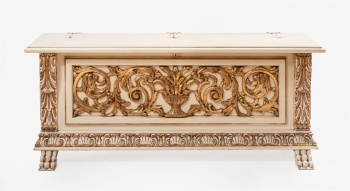 Arca en madera tallada, lacada y dorada con decoración de jarrón, hojas, animales y rocallas. Rematando en patas de garra, bisagras y cerradura en hierro pintado.