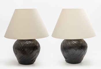 Descarga el catálogoPareja de lámparas de sobremesa en cerámica esmaltada en color negro representando envoltura de cuero. Estilo Regencia.