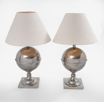 Pareja de lámparas de sobremesa en metal plateado con forma de globo. Estilo Regencia.