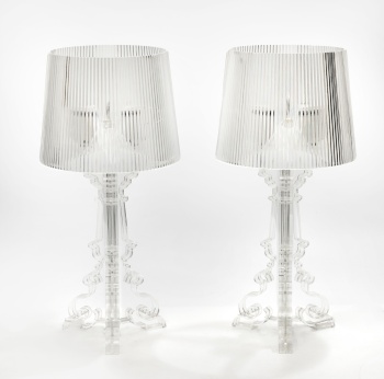 Pareja de lámparas de sobremesa en acrílico transparente, pie en forma de trípode con decoración vegetal y tulipas con gallones.
