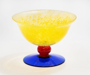 Centro de mesa en cristal de Murano en color amarillo, rojo y azul en forma de copa.