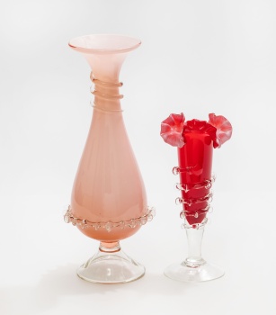 Lote compuesto por jarrón y violetero en cristal de Murano con decoración vegetal en color rosa y rojo. Estilo Isabelino.