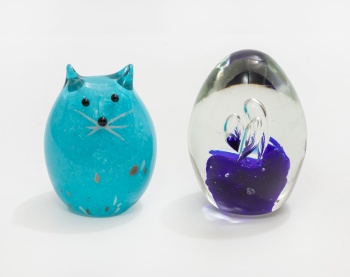 Lote compuesto por 2 pisapapeles en cristal de Murano con decoración de gato y fondo marino en color azul.