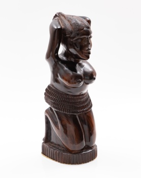 Escultura en madera tallada de ébano representando mujer de tribu.
