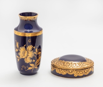 Lote compuesto por jarrón y joyero en porcelana azul cobalto y dorada con decoración de flores, hojas, gallones y greca alrededor. Estilo Luis XVI. Sello en la base. Manufactura Limoges.
