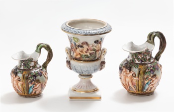 Lote compuesto por 2 jarras y copa en porcelana policromada y dorada representando "La vendimia" y "Ángeles jugando, flores y asas con decoración de mascarones". Sello en la base. Manufactura Capodimonte.