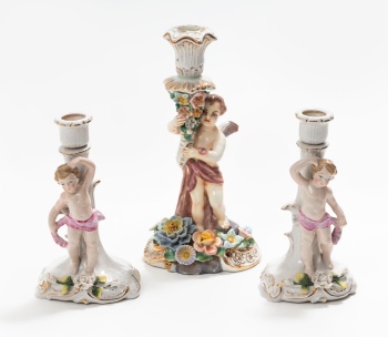 Lote compuesto por 3 candeleros en porcelana policromada y dorada representando figuras de ángeles, flores y hojas. Estilo Luis XVI.