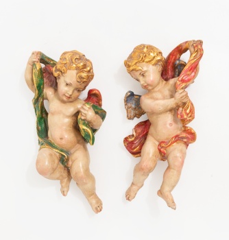 Pareja de figuras en resina pintada y dorada representando ángeles.