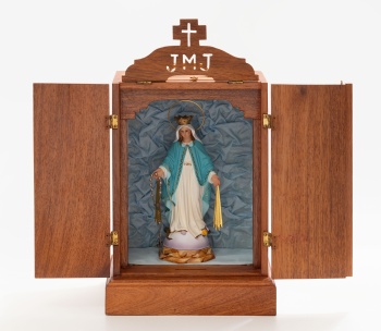Limosnero en madera de caoba con figura interior en escayola policromada y dorada representando "Virgen Inmaculada".