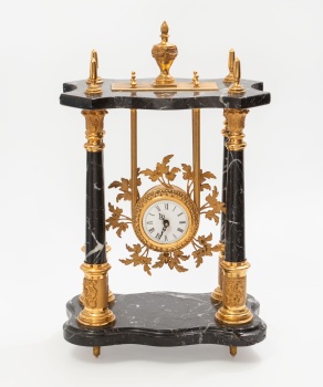 Reloj de sobremesa en mármol con decoración de columnas a los lados y metal dorado representando flores, hojas y copa central. Esfera blanca con números romanos. Estilo Luis XVI.