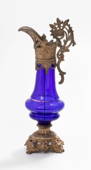 Jarra en calamina dorada con decoración vegetal, flores y rocallas. Cristal azul cobalto y dorado. Estilo Luis XVI.