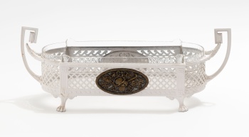 Jardinera en metal pintado en blanco representando alegoría a la música, hojas, guirnaldas y remates en pata de garra. Cristal interior. Época Art Decó.