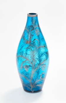 Jarrón en cristal azul y plata con decoración de pájaros, flores y frutas. Estilo Luis XVI.