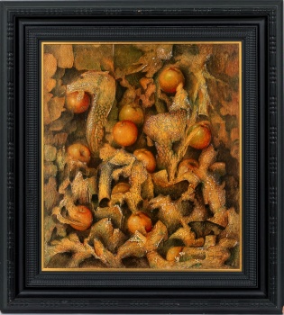 (Vélez-Málaga, 1950 - 1990) "Danza de manzanas" Firmado: Jurado Lorca 80 Técnica mixta / Tabla 55 x 48 cm. ; 75 x 68 cm. (con marco)