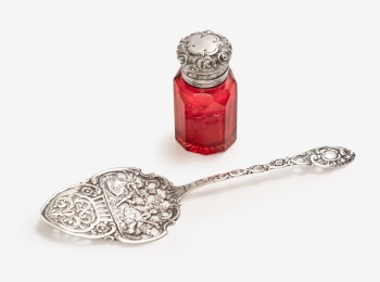 Lote compuesto por pala en plata calada representando jóvenes en el jardín con pastora, oveja y flores. Estilo Luis XVI. Marcas de platero y especiero en cristal con tapón en plata con decoración de flores. Marcas de platero. Inglaterra.