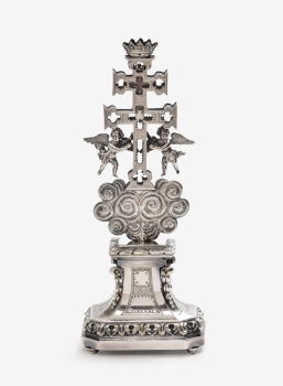 Relicario en bronce plateado representando la Cruz de Caravaca. Interior con reliquia y base con decoración vegetal y rocallas. Estilo Luis XVI.