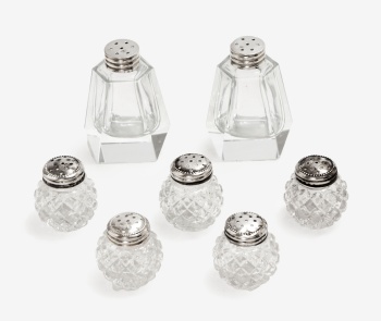Conjunto de 7 saleros en cristal y tapones en plata. Marcas de platero.
