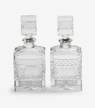 Pareja de licoreras en cristal de Bohemia tallado con decoración de diamantes y golletes en plata. Estilo Luis XVI. Marcas de platero.