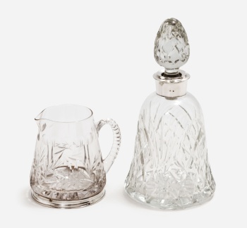 Conjunto de jarra y licorera en cristal tallado y grabado con decoración vegetal. Gollete y base en plata. Marcas de platero. Estilo Regencia.
