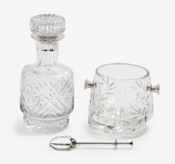 Juego de licorera, hielera y pinzas para hielo en cristal de Bohemia tallado y grabado con gollete y asas en plata. Estilo Victoriano. Marcas de platero.